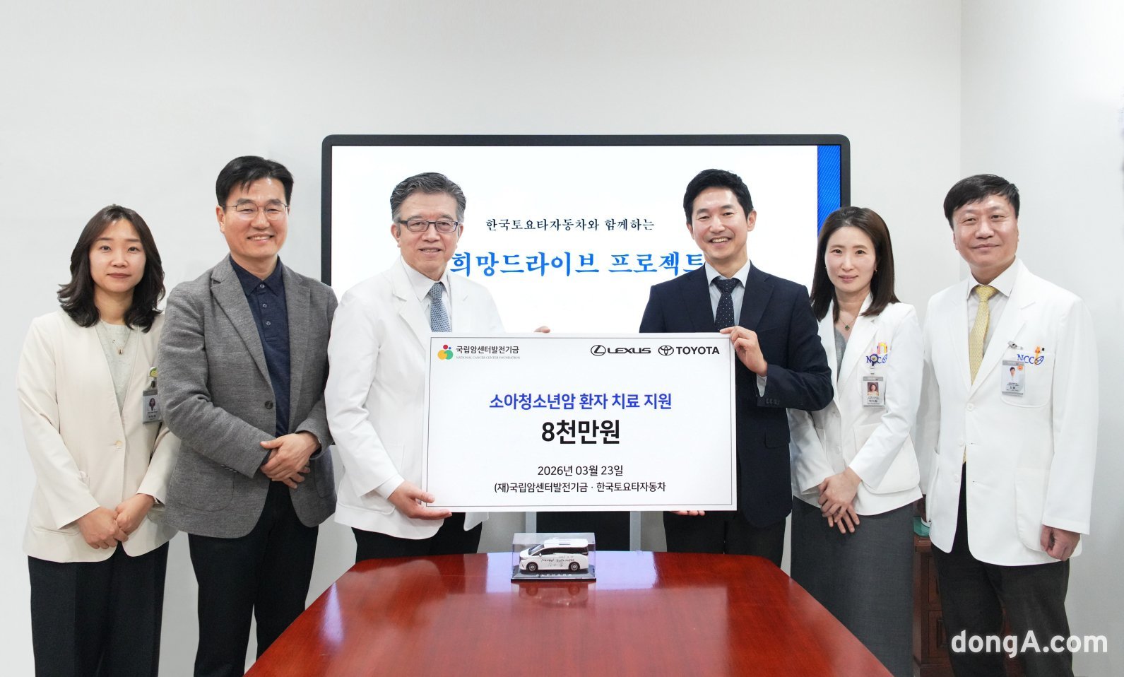 한국토요타자동차가 국립암센터에 기부금 8000만 원을 전달했다. 지난 23일 전달식에는 이병진 한국토요타 부사장과 양한광 국립암센터 원장 등 주요 관계자들이 참석해 자리를 빛냈다. 행사 이후 소아·청소년암 환아들이 생활하는 병동을 방문해 응원하는 시간을 가졌다.