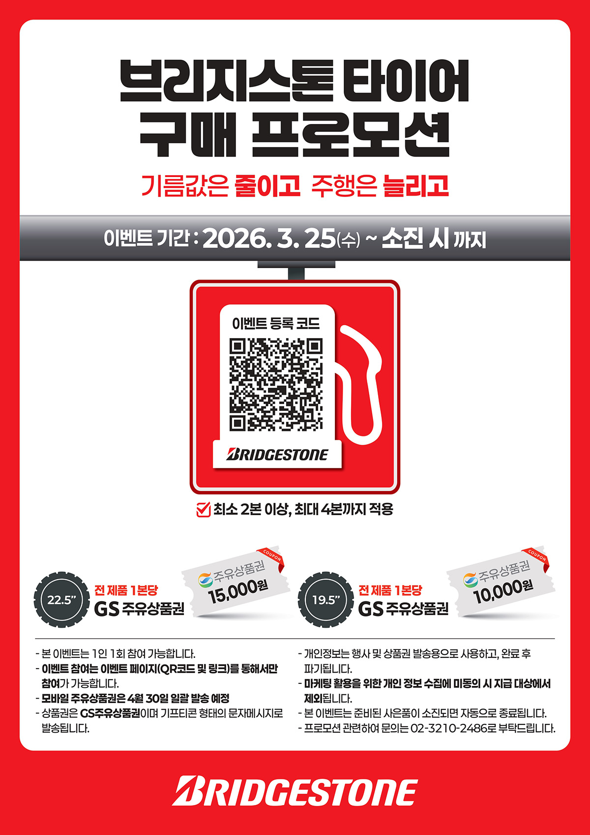 참여를 희망하는 고객은 전국 브리지스톤 타이어 대리점 및 취급점에서 제품 구매 후, 공식 홈페이지 내 이벤트 페이지에서 QR코드를 통해 신청하면 된다. 지급되는 주유상품권은 모바일 기프티콘 형태로 오는 4월 30일에 일괄 발송될 예정이다.