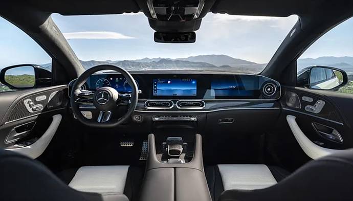 실내의 가장 큰 변화는 대시보드 전체를 가로지르는 MBUX 슈퍼스크린이다. 12.3인치 디스플레이 세 개가 하나의 유리 패널 아래 통합되어 깨끗하고 미래적인 분위기를 연출한다. 새로운 운영체제인 MB.OS는 무선 업데이트(OTA)를 지원하며, 구글 맵 기반의 내비게이션과 AI 가상 비서 기능을 포함한다. 특히 증강현실(AR) 헤드업 디스플레이가 모델 최초로 적용되어 실제 도로 위에 주행 방향을 투영한다. 기존의 불편했던 터치 슬라이더 대신 물리적인 롤러형 볼륨 조절기가 부활한 점도 눈에 띄는 변화다.