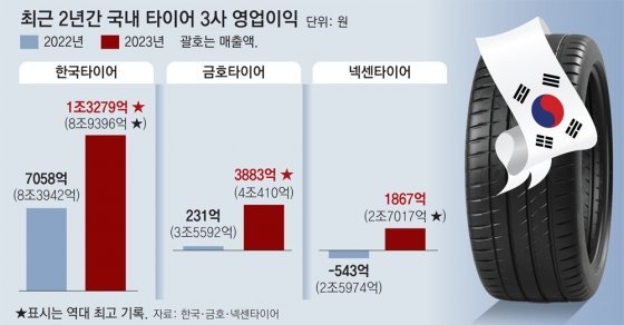 타이어 업계가 지난해 역대 최대 실적을 거뒀다. 단가가 비싼 고부가가치 타이어가 많이 팔리고, 해상 물류비와 원자재 가격 하락 덕에 수익성이 좋아진 것이다.